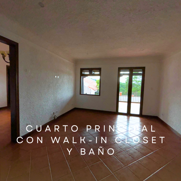 3 niveles: amplia sala, comedor, cocina moderna, 3 habitaciones con baño y walking closet, terraza con vista, 3 parqueos, jardín con fuente.